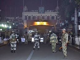 flag-lowering ceremony at the main Indo-Pakistan land border crossing.